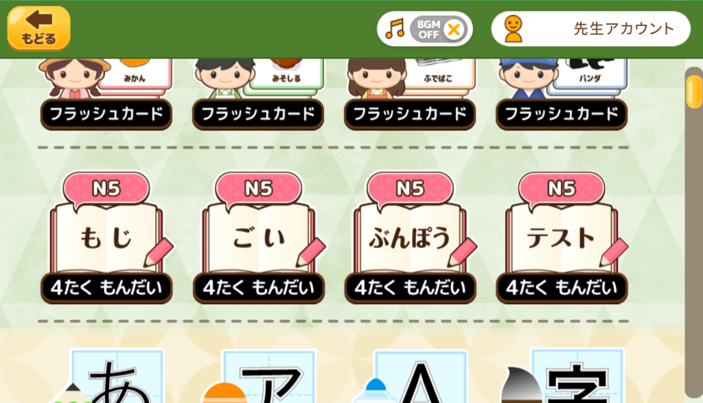今回のアップデートでは、日本語能力試験(JLPT)のN5に対応した文字・語彙・文法を学びながら、実践対策ができる「4たく もんだい」を追加しました。